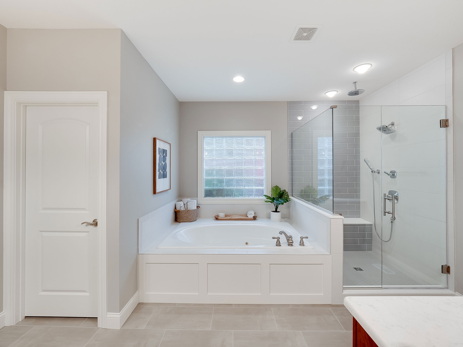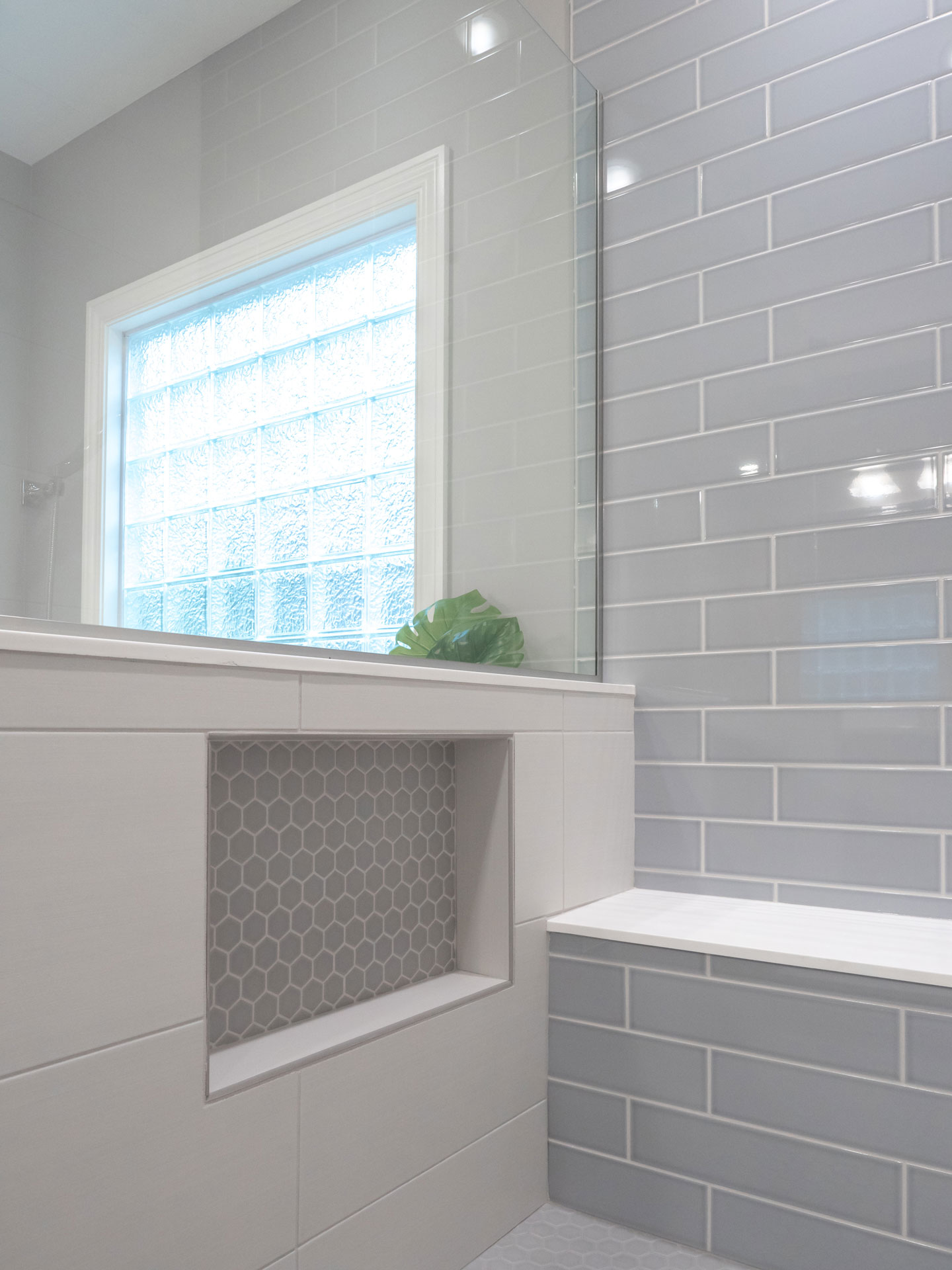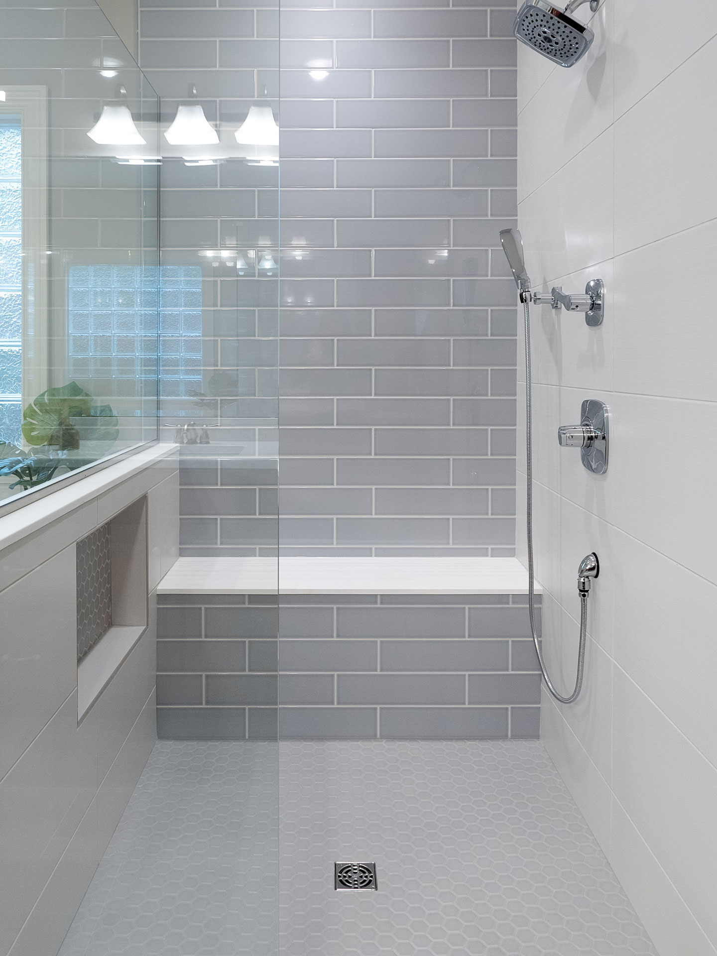 Mini hexagon and elongated subway tiles combine to transform the shower in this primary bathroom into a contemporary and inviting space!