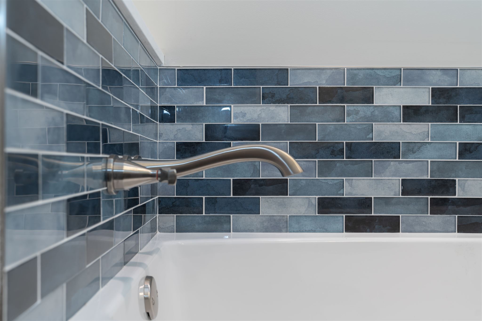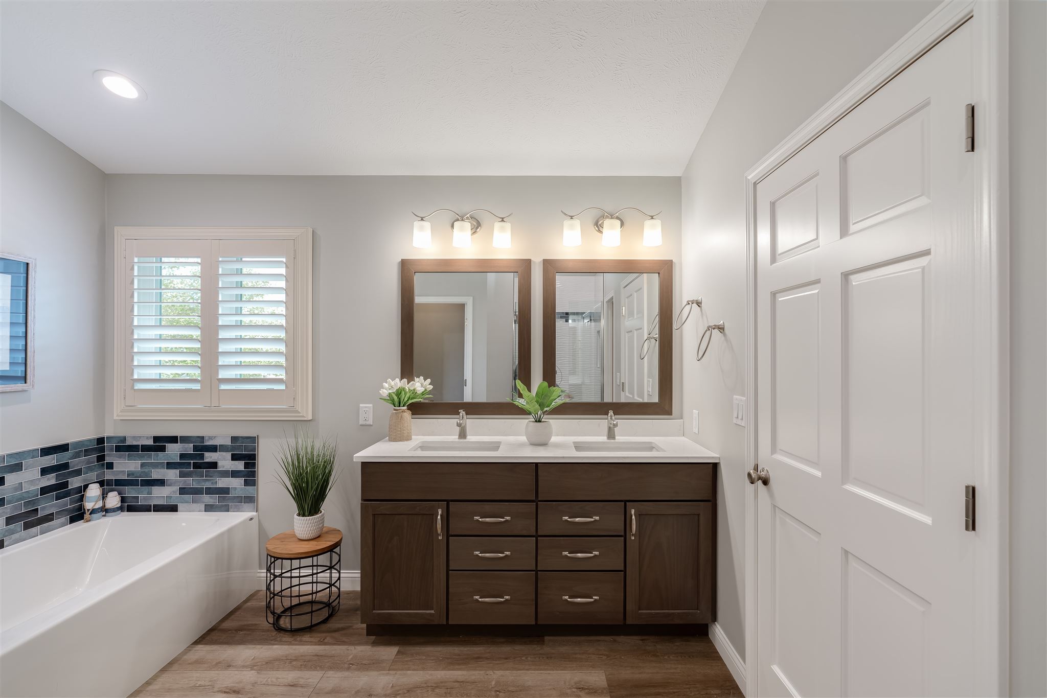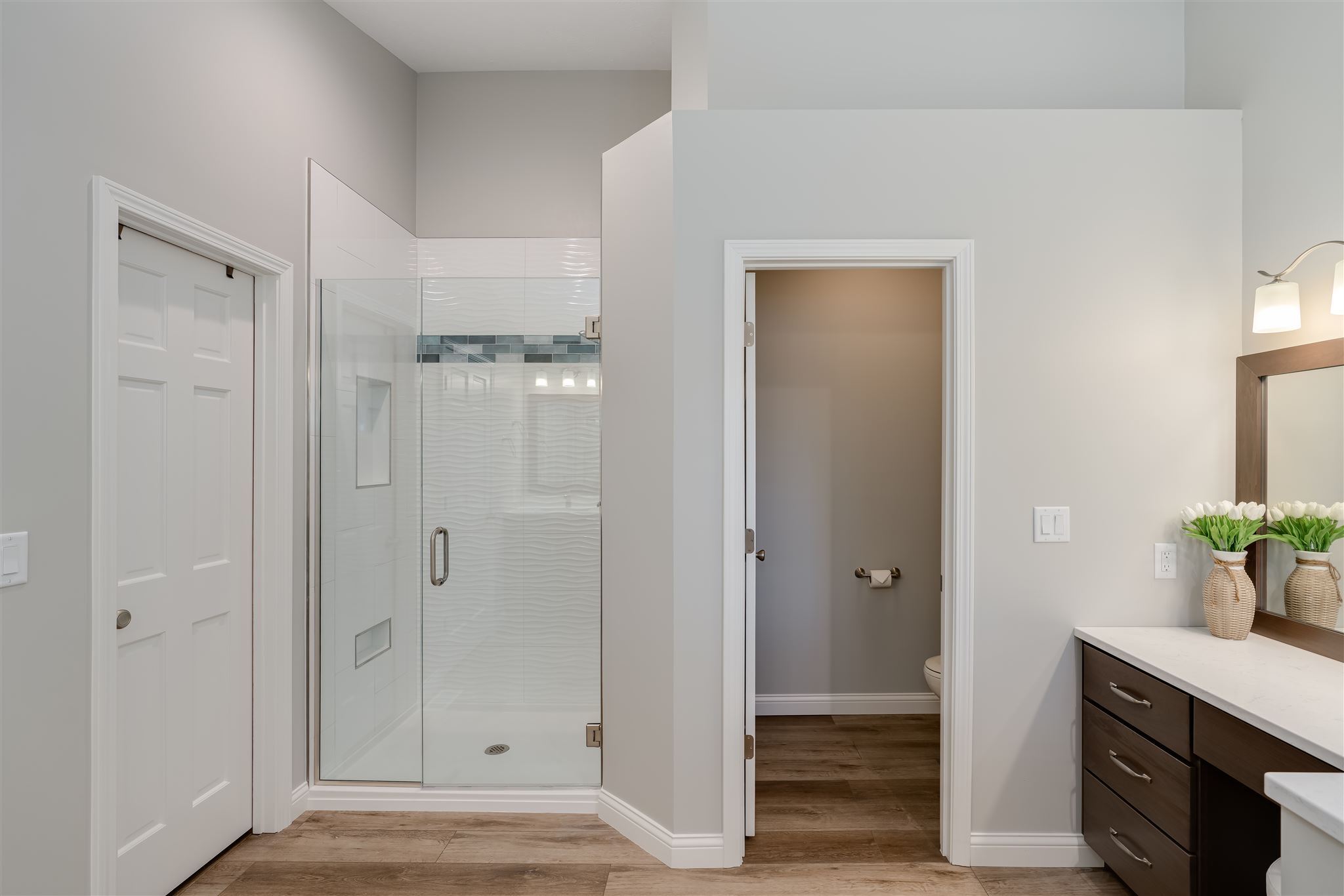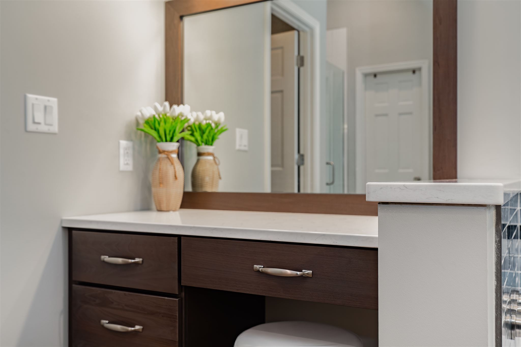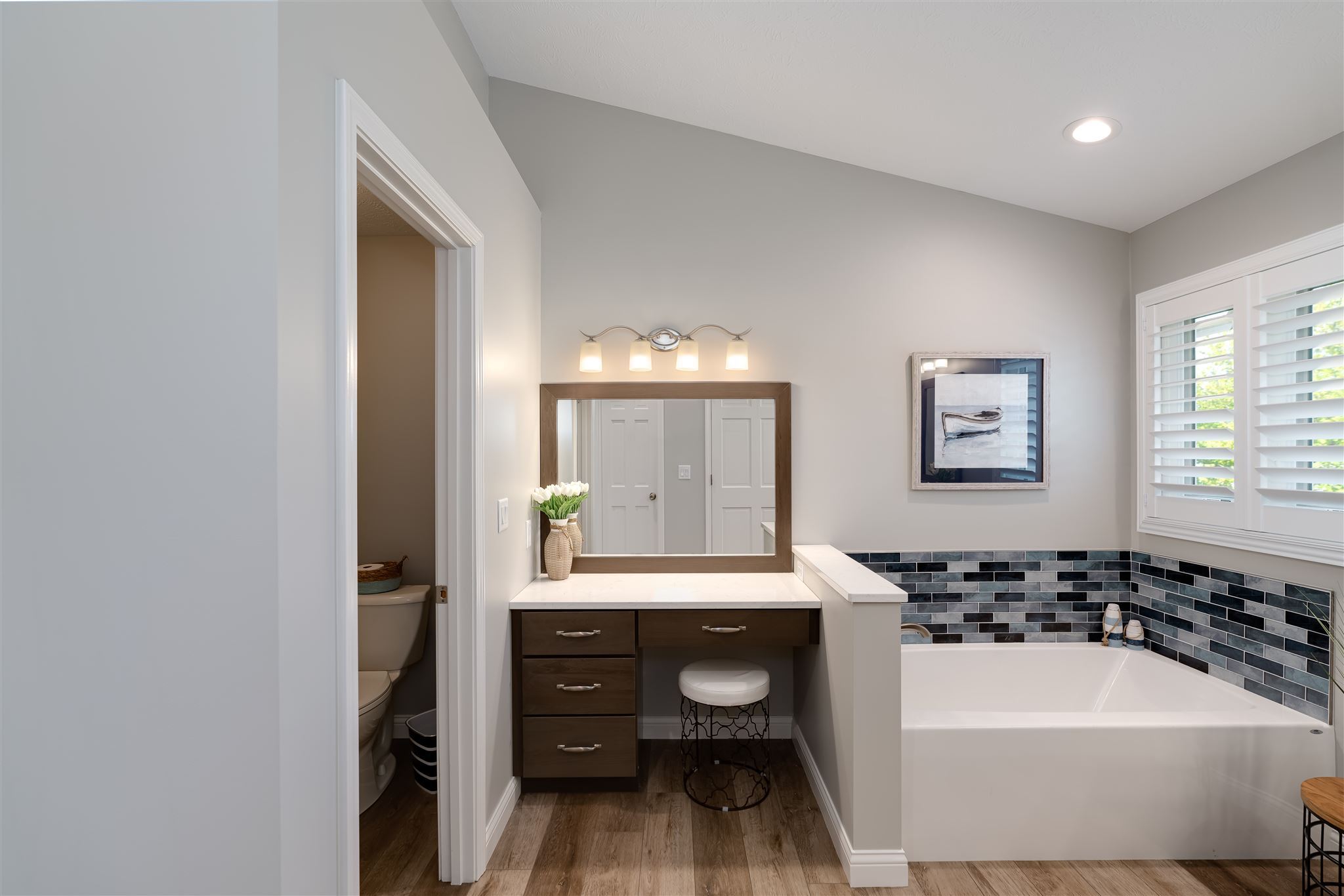 The desire for a more practical bathtub and a dedicated makeup vanity prompted the renovation of this primary bathroom. The color palette reflects the homeowner’s love of the sand and sea while the tile selections are reminiscent of ocean waves. The improved layout and calming colors provide the feel of a daily seaside retreat.