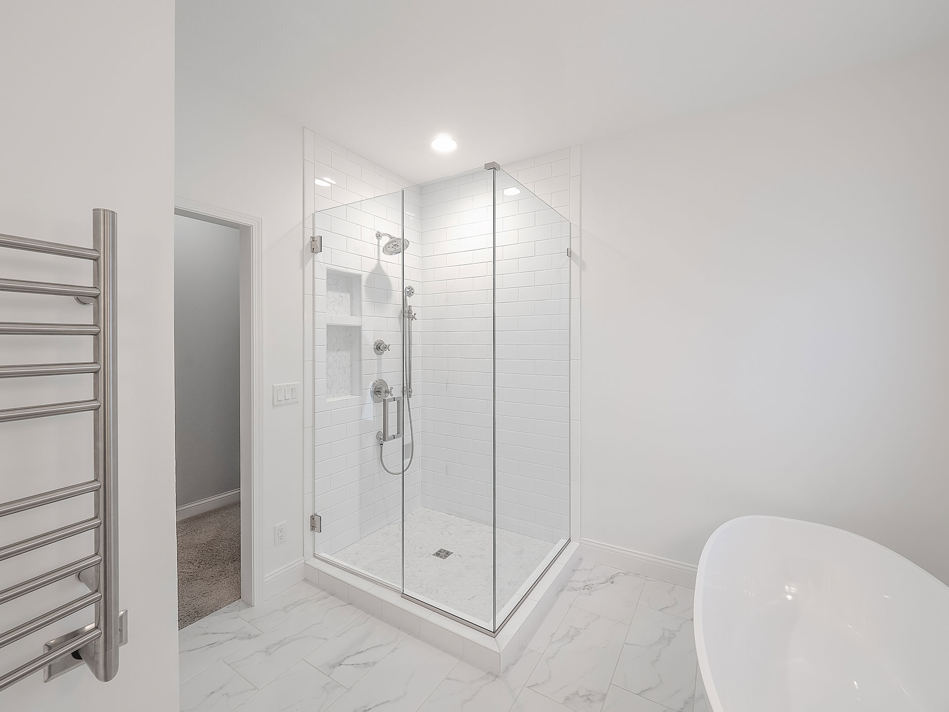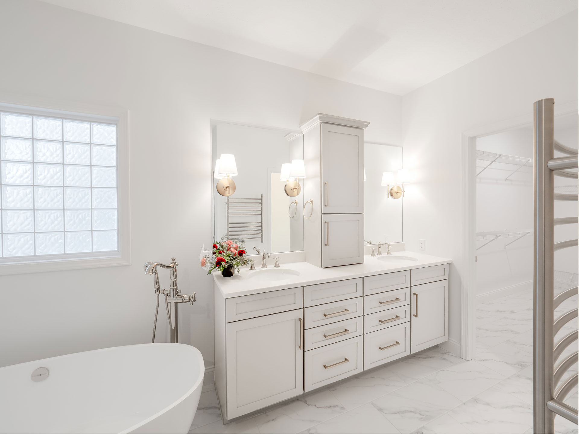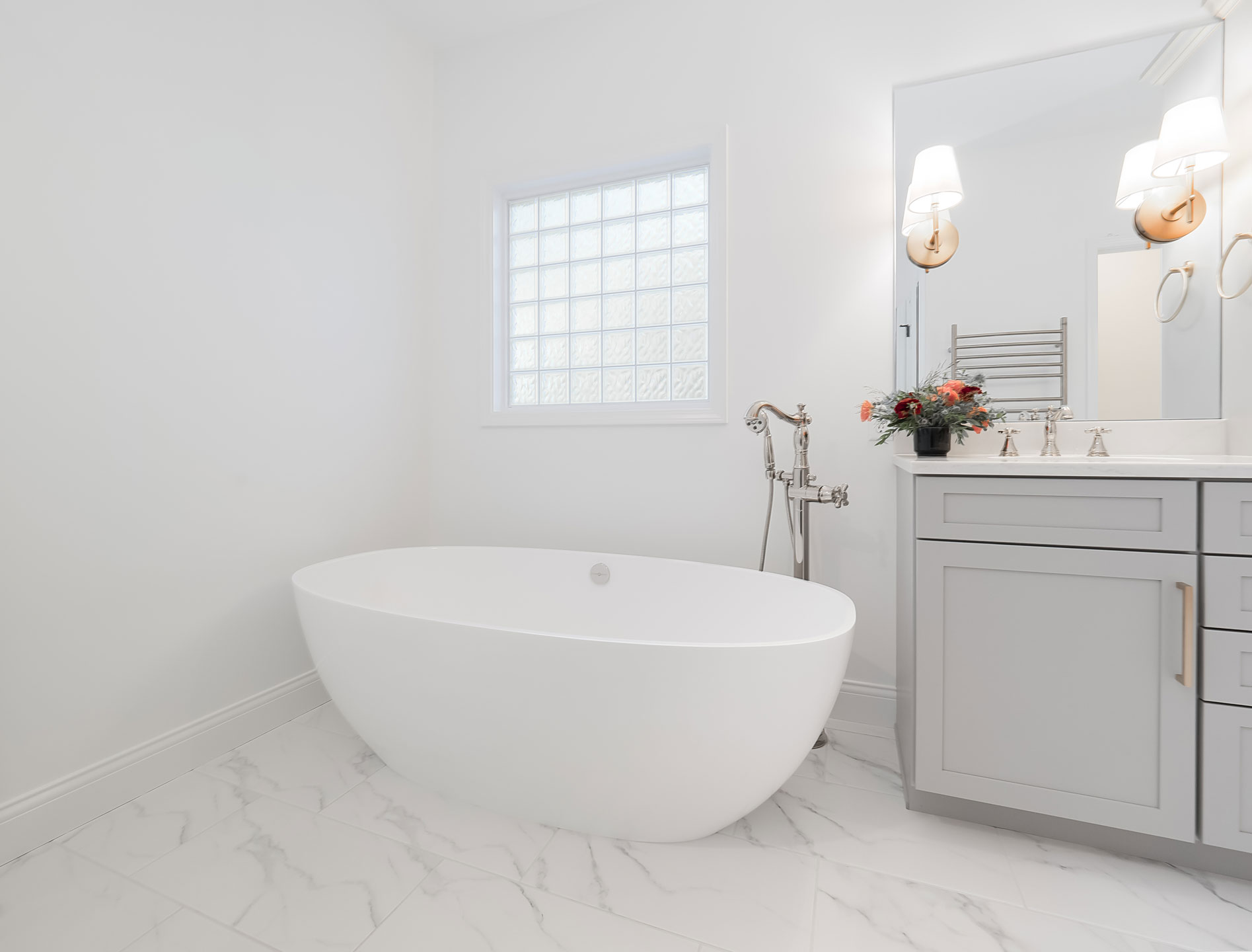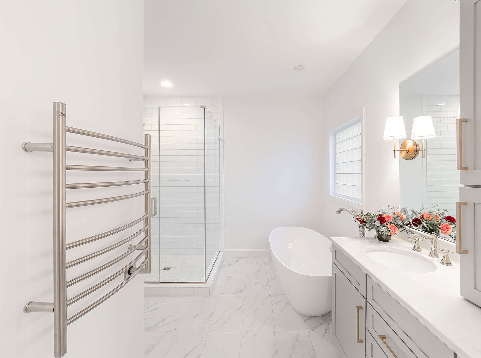 A light and airy color palette with soft gray cabinetry, a freestanding tub, marble and polished nickel accents and a towel warming rack complete this primary bathroom transformation!
