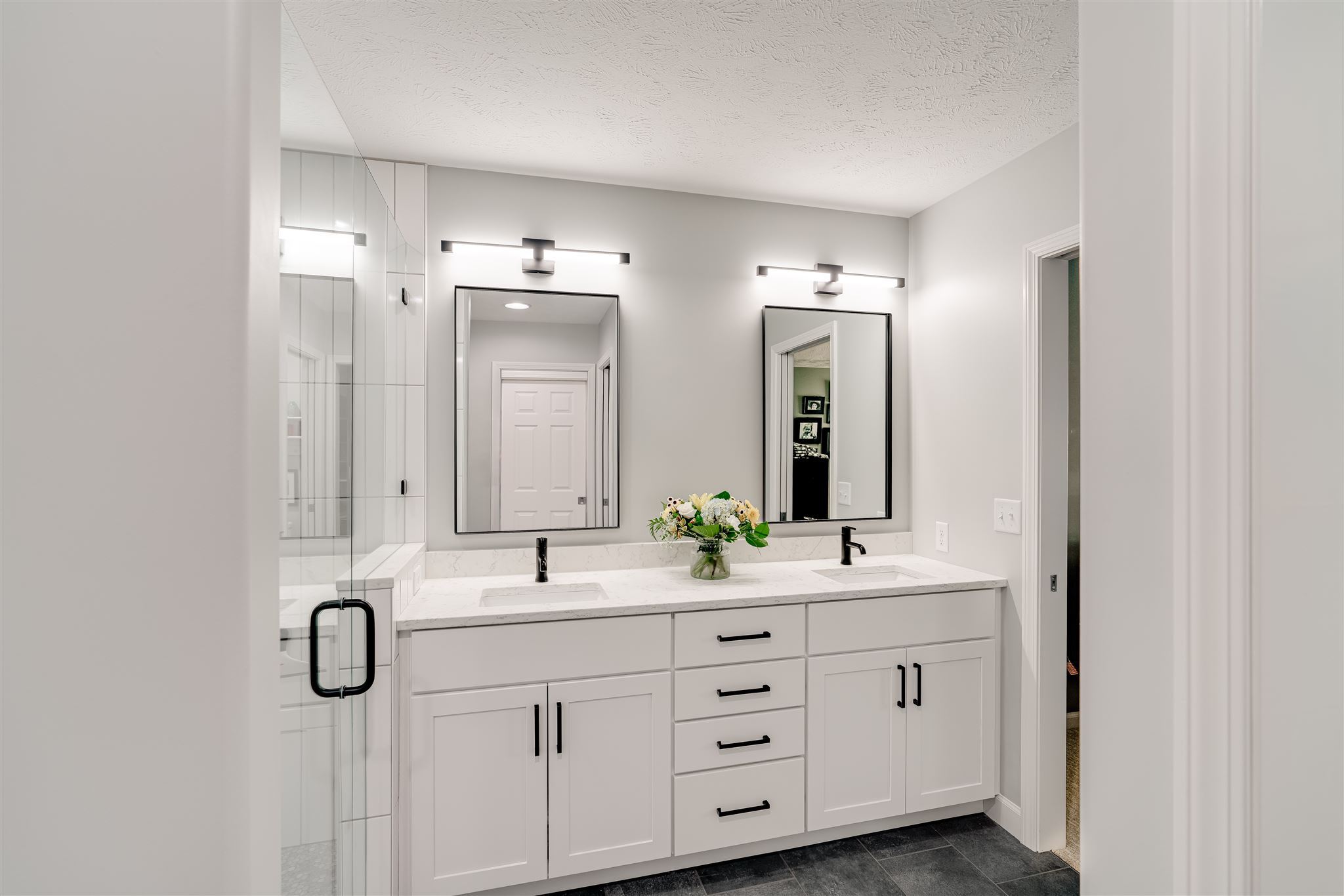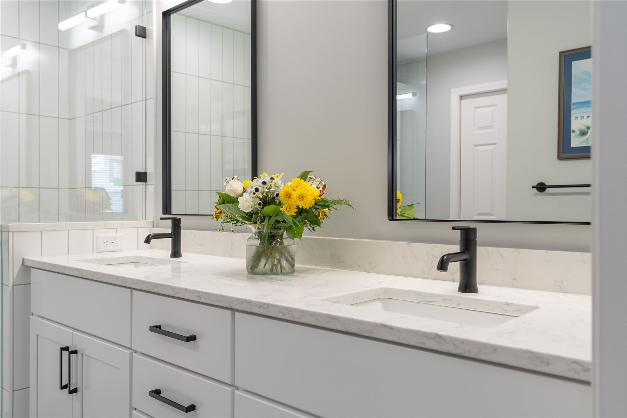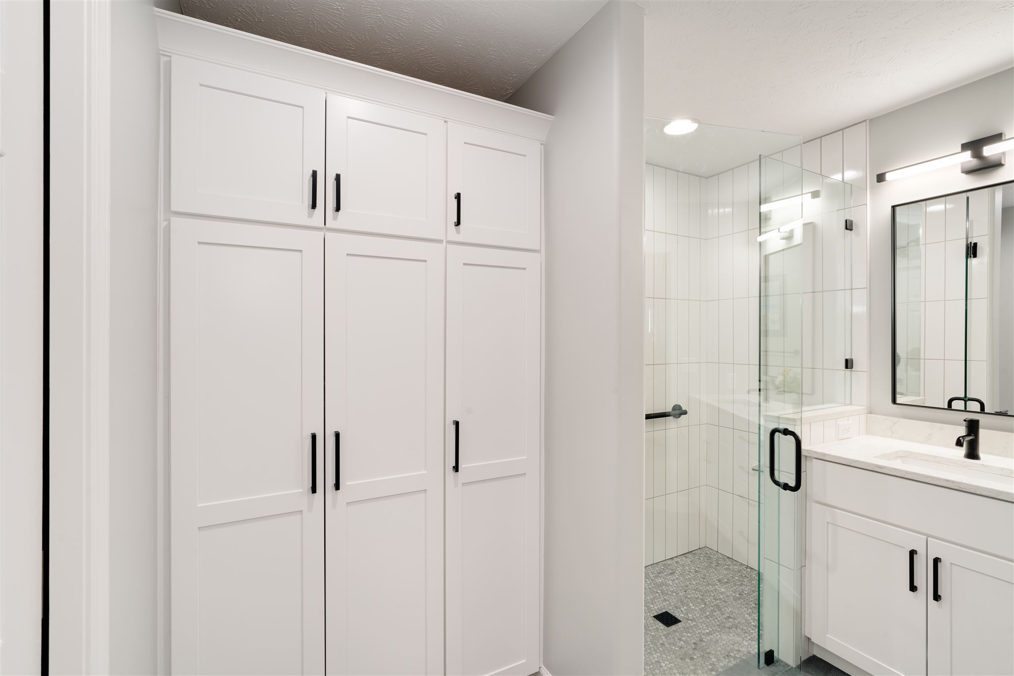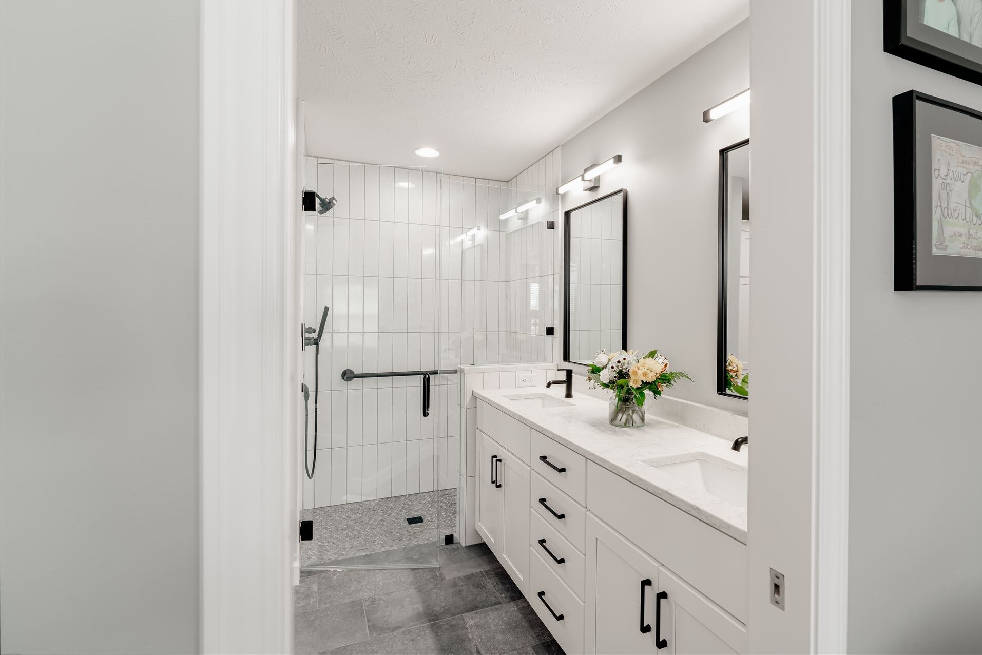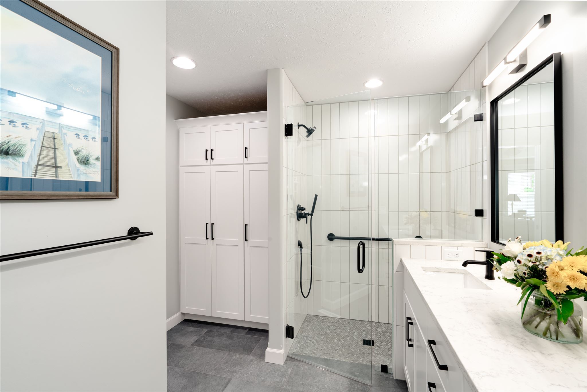Removing the garden tub in this primary bathroom opened up the space for a generous walk-in shower. A spacious linen cabinet now occupies the location of the former shower and provides ample storage. A crisp black & white color scheme completes this fresh and airy transformation.