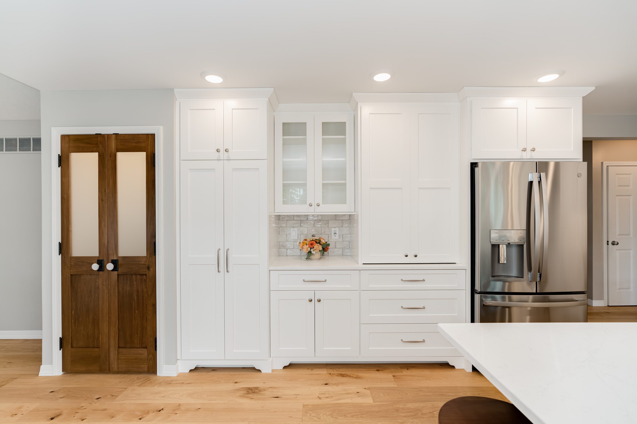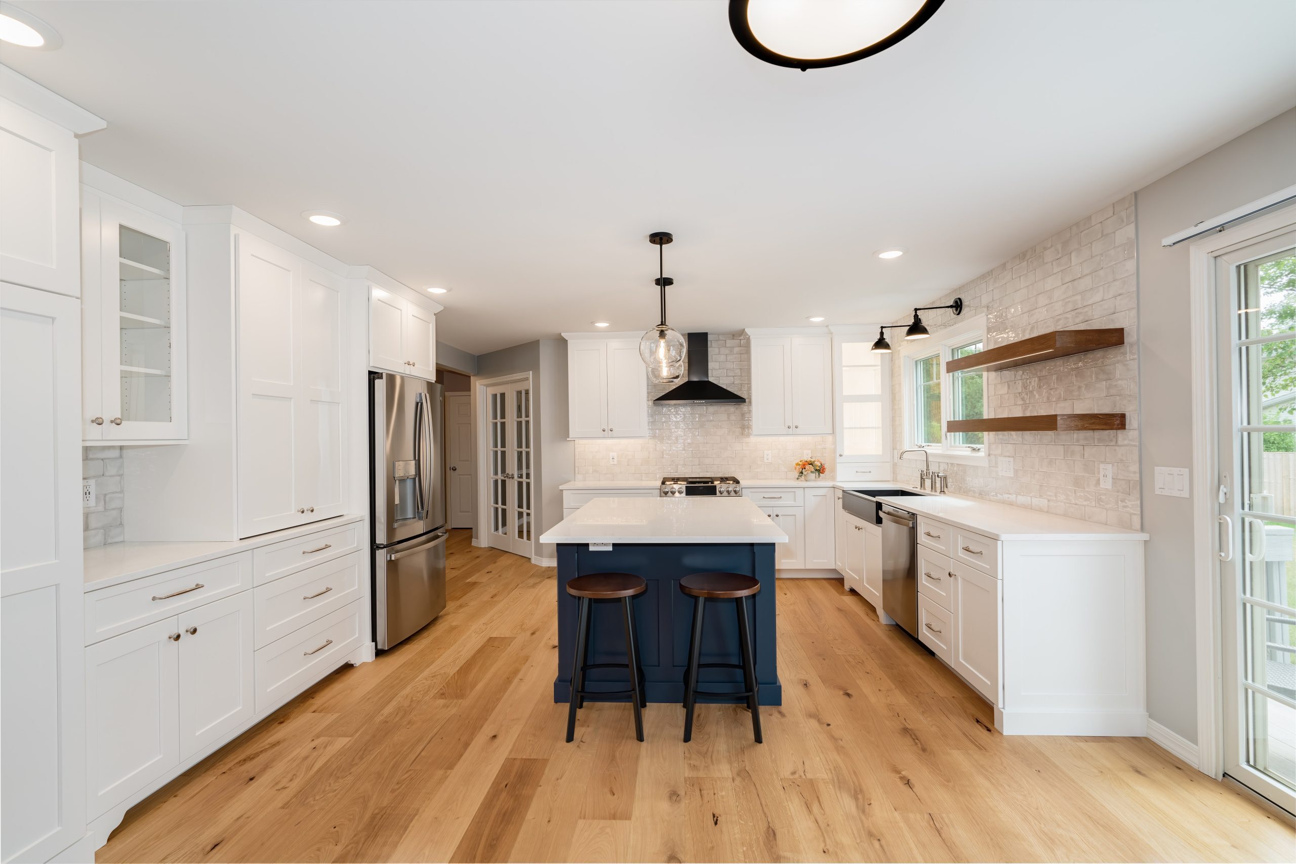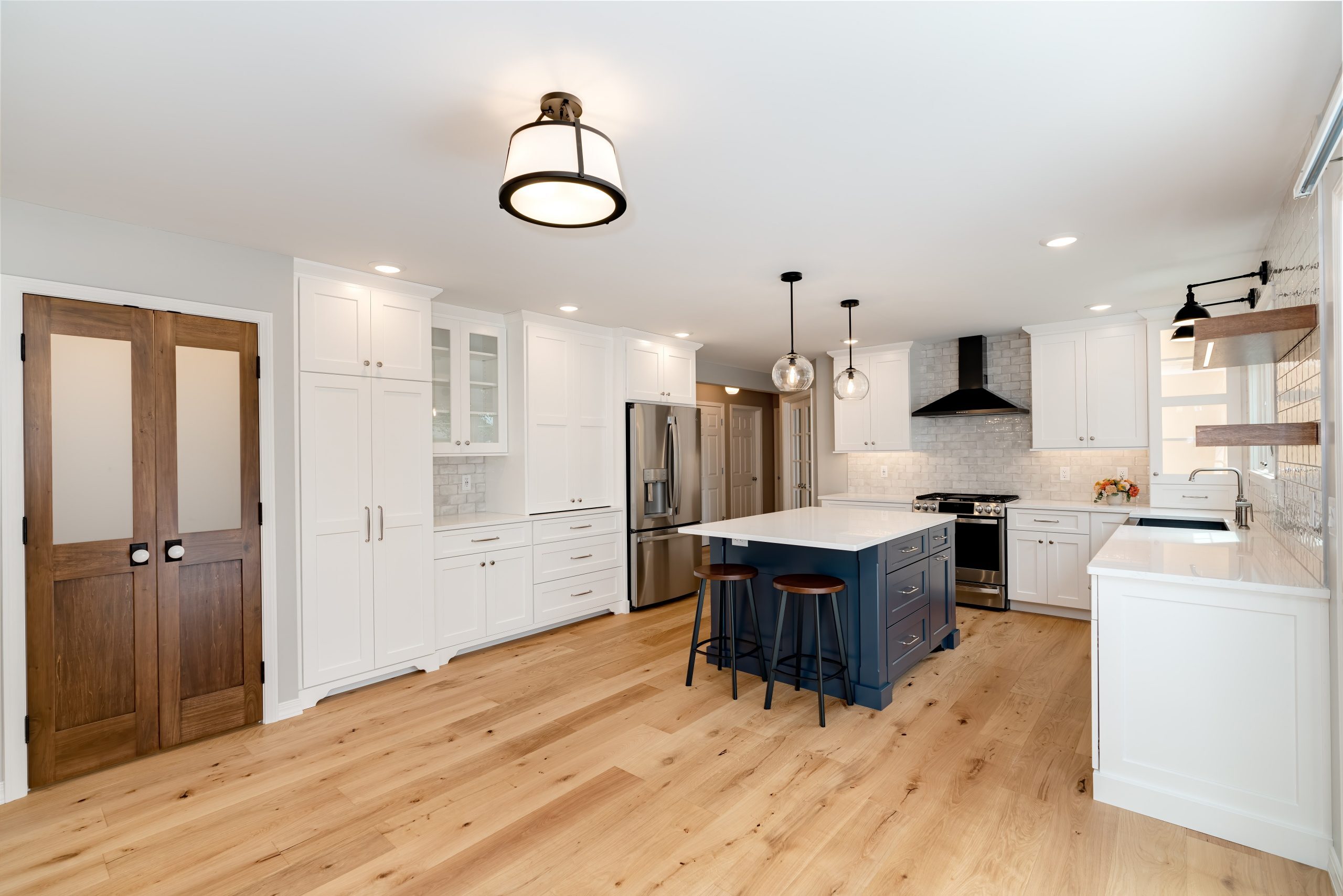 The layout of a u-shaped kitchen is reconfigured to achieve a more functional work flow. Crisp white cabinetry and a navy island are accented by new French oak flooring. A bank of cabinetry provides an abundance of storage while a custom poplar pantry door delivers additional charm and character to this kitchen transformation!