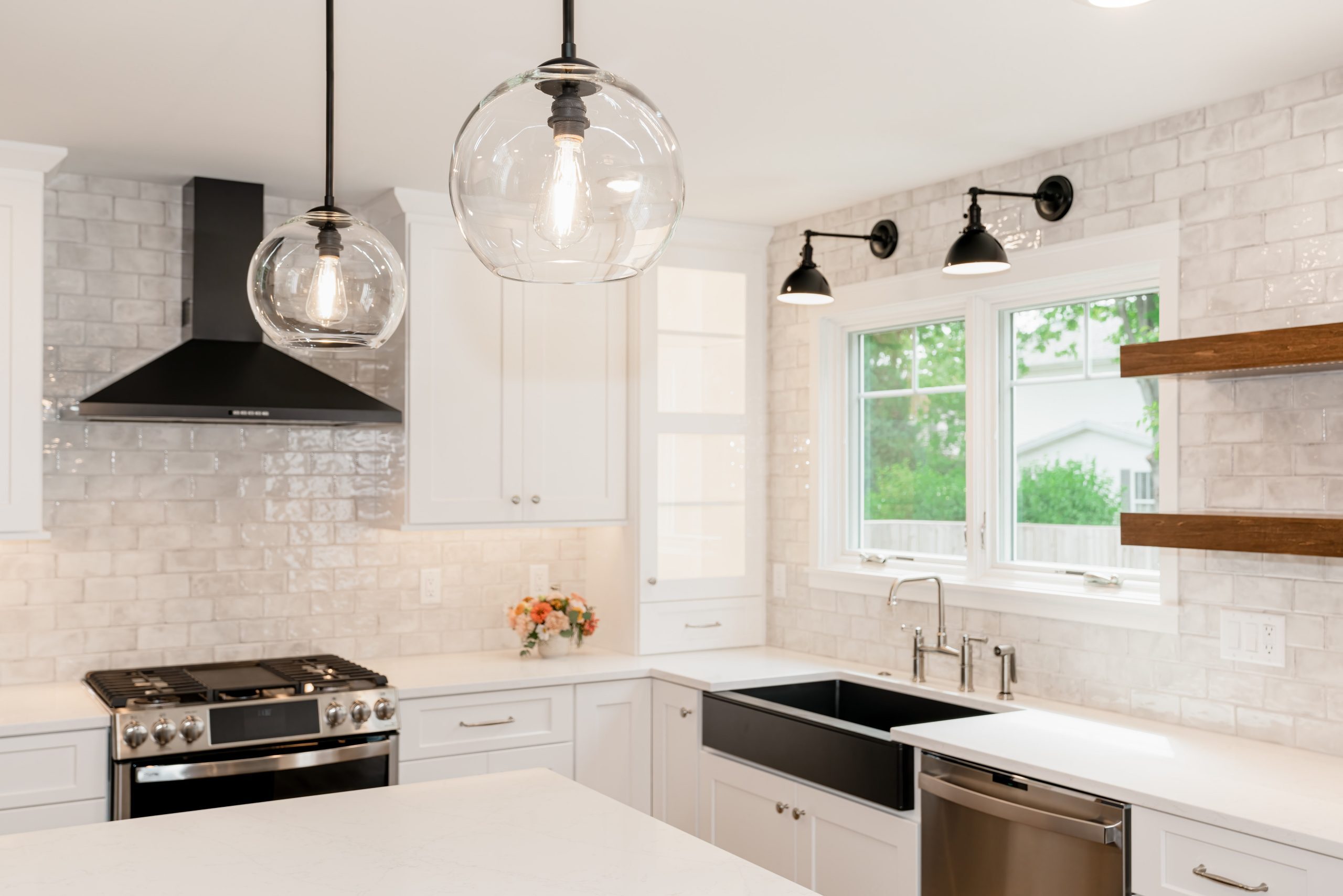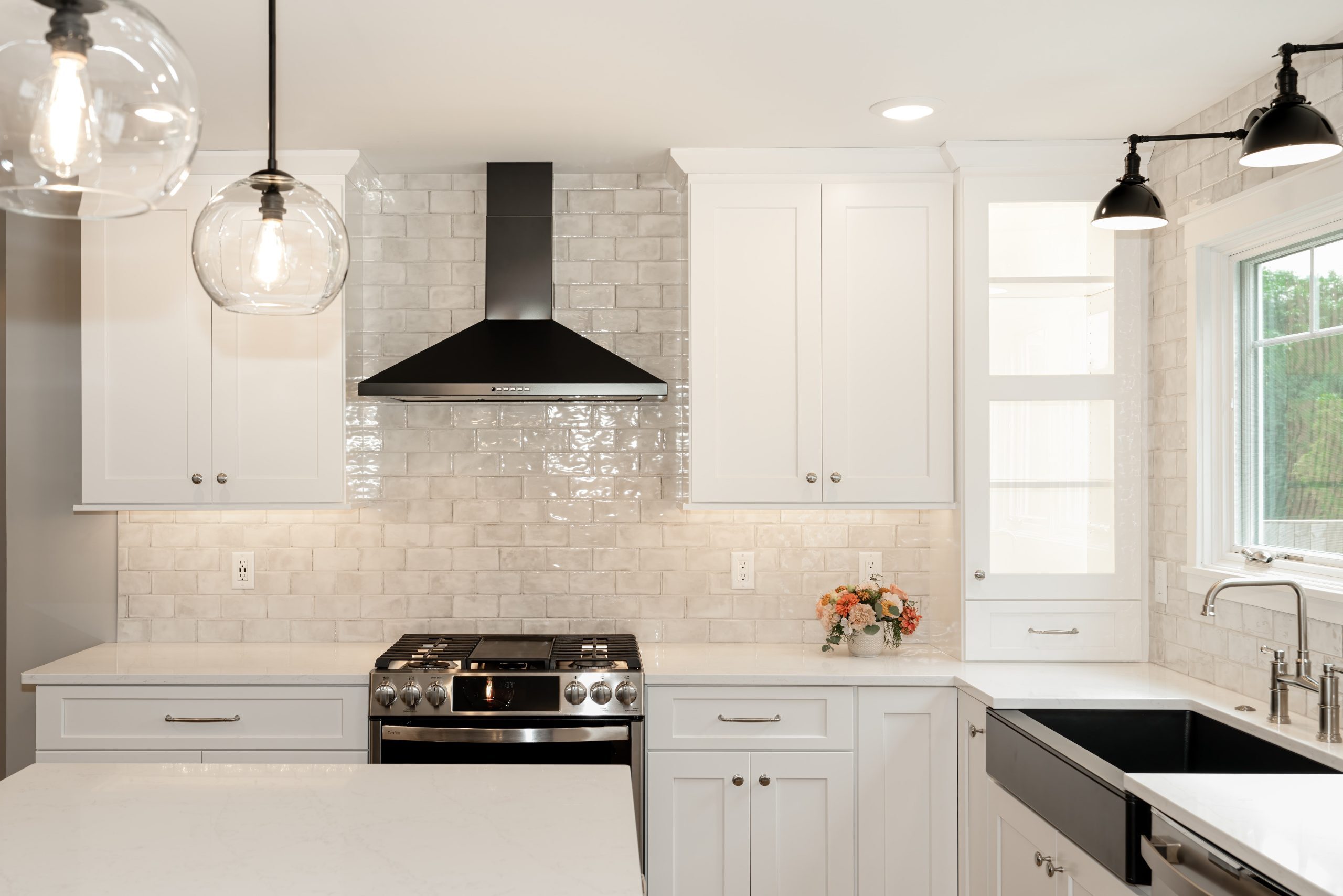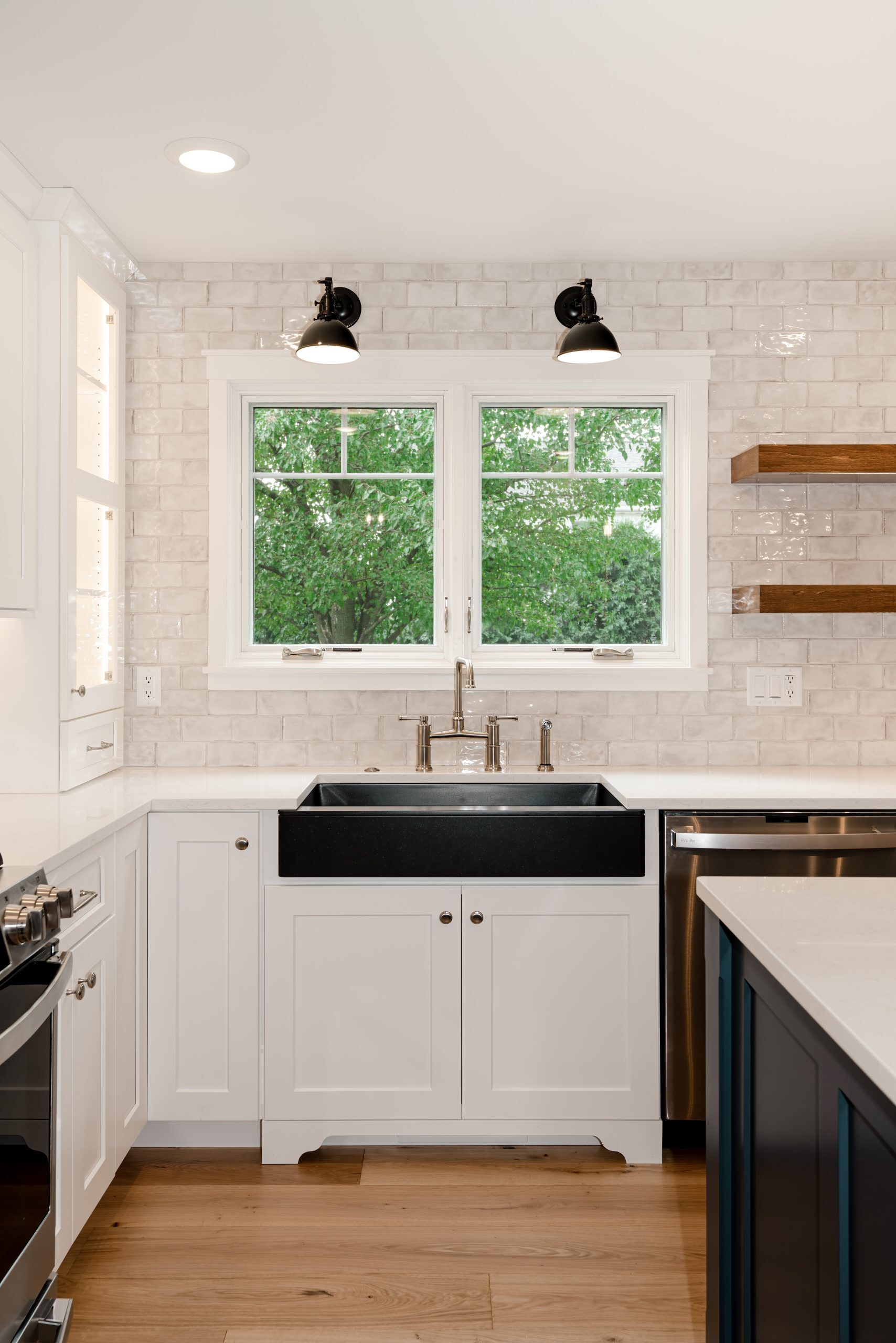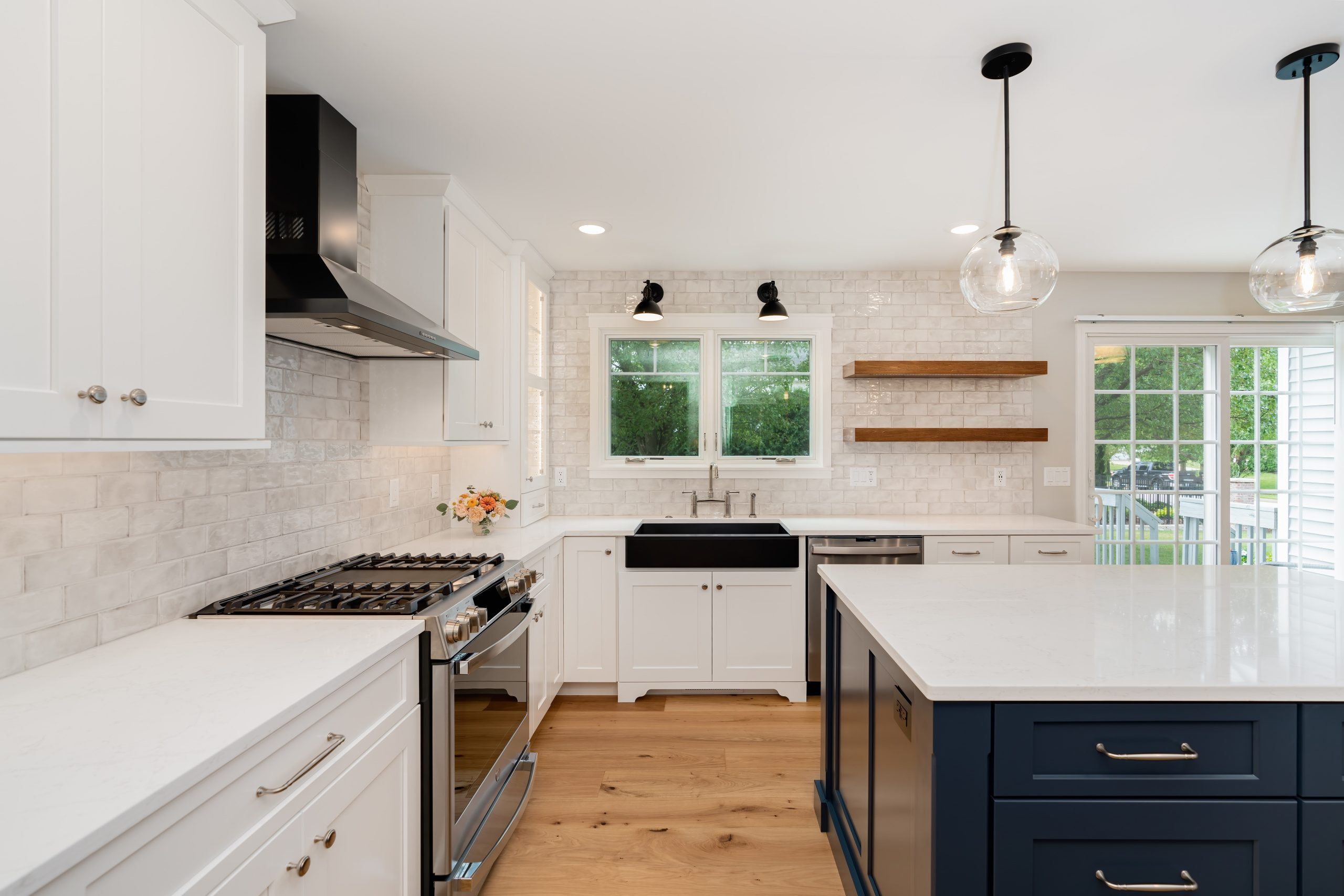 The layout of a u-shaped kitchen is reconfigured to achieve a more functional work flow. Crisp white cabinetry and a navy island are accented by new French oak flooring. A bank of cabinetry provides an abundance of storage while a custom poplar pantry door delivers additional charm and character to this kitchen transformation!