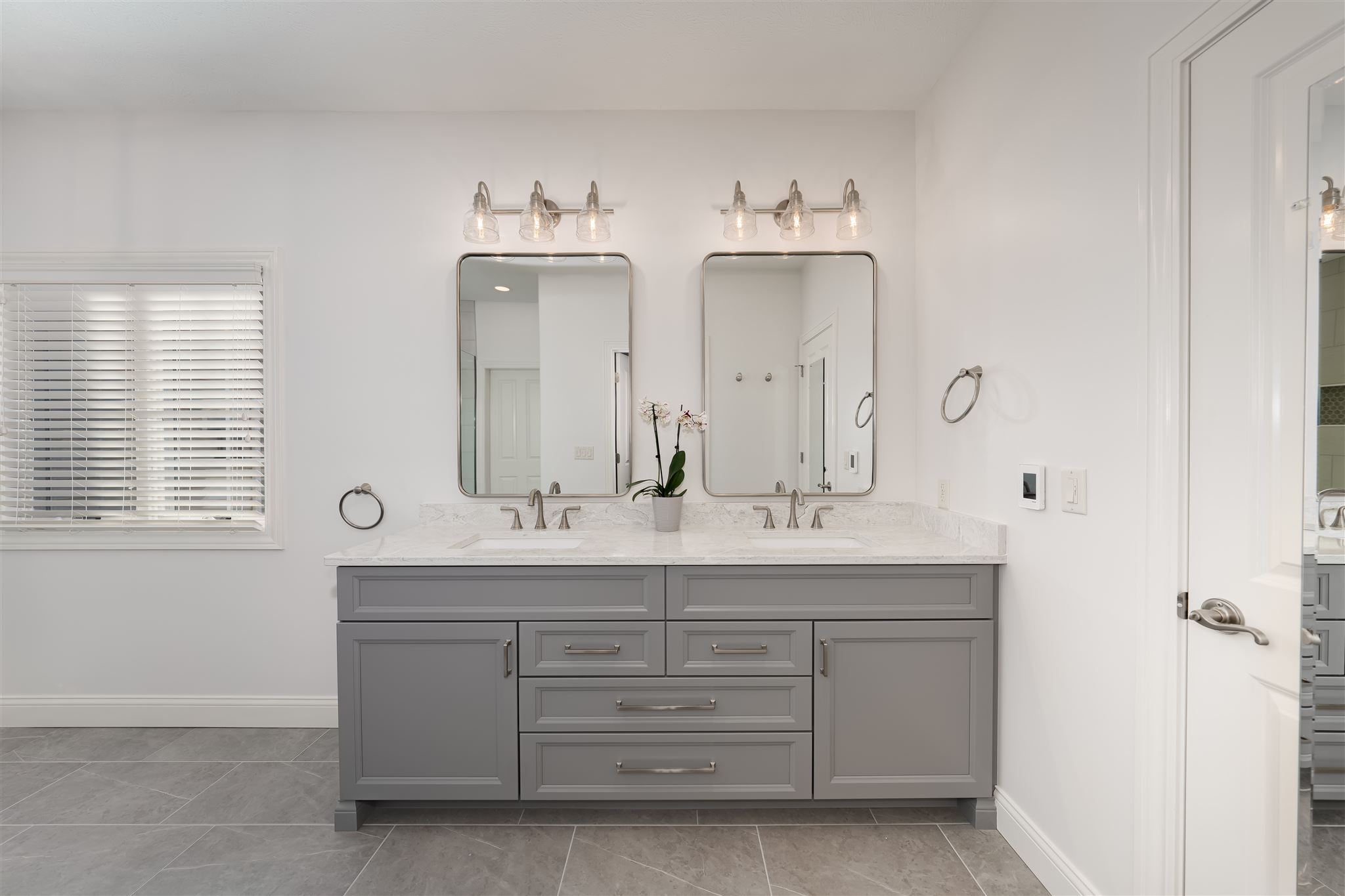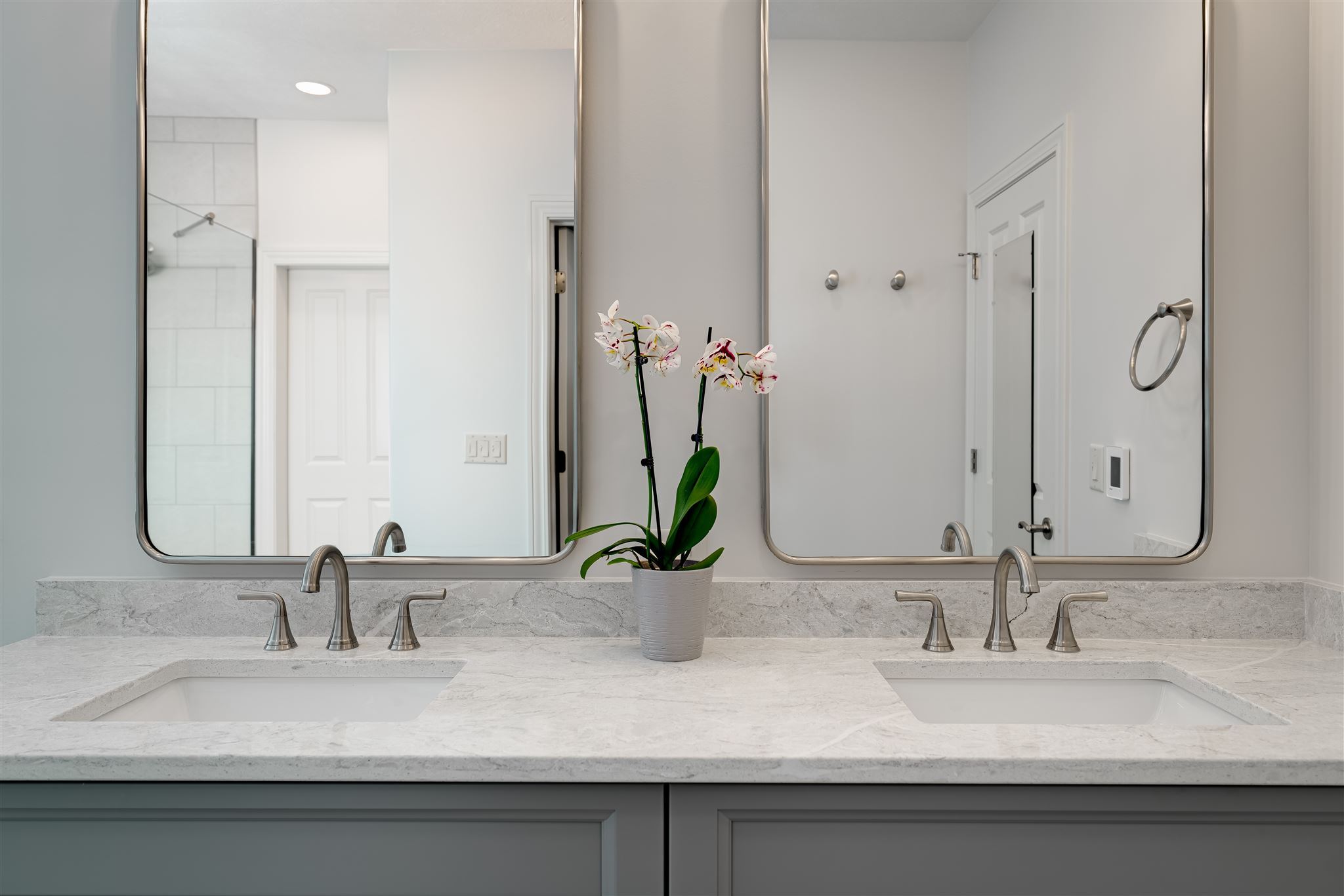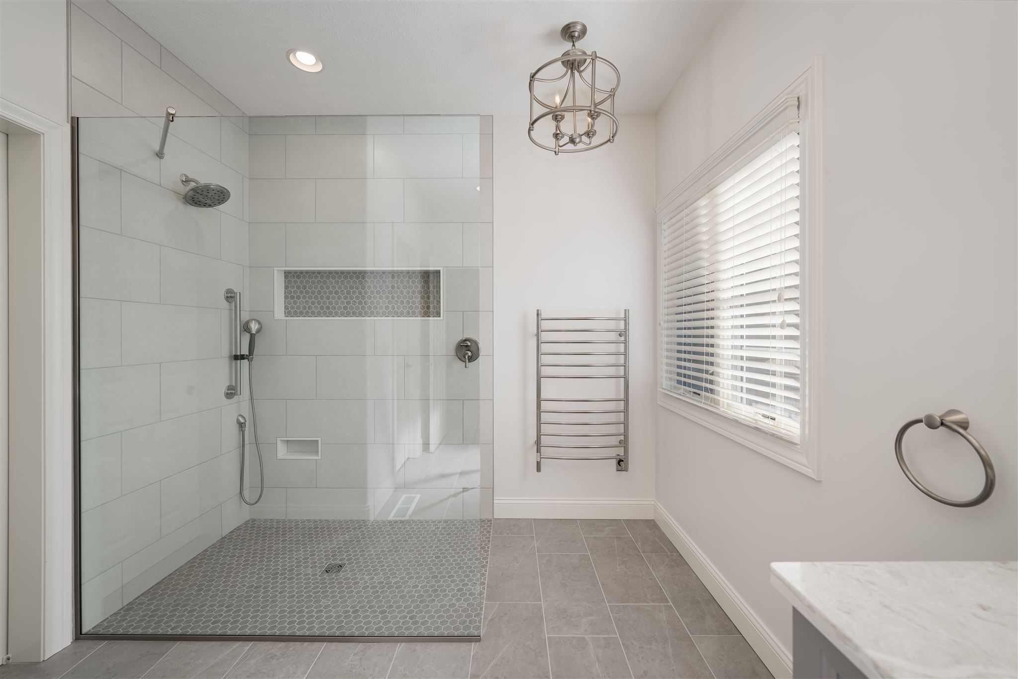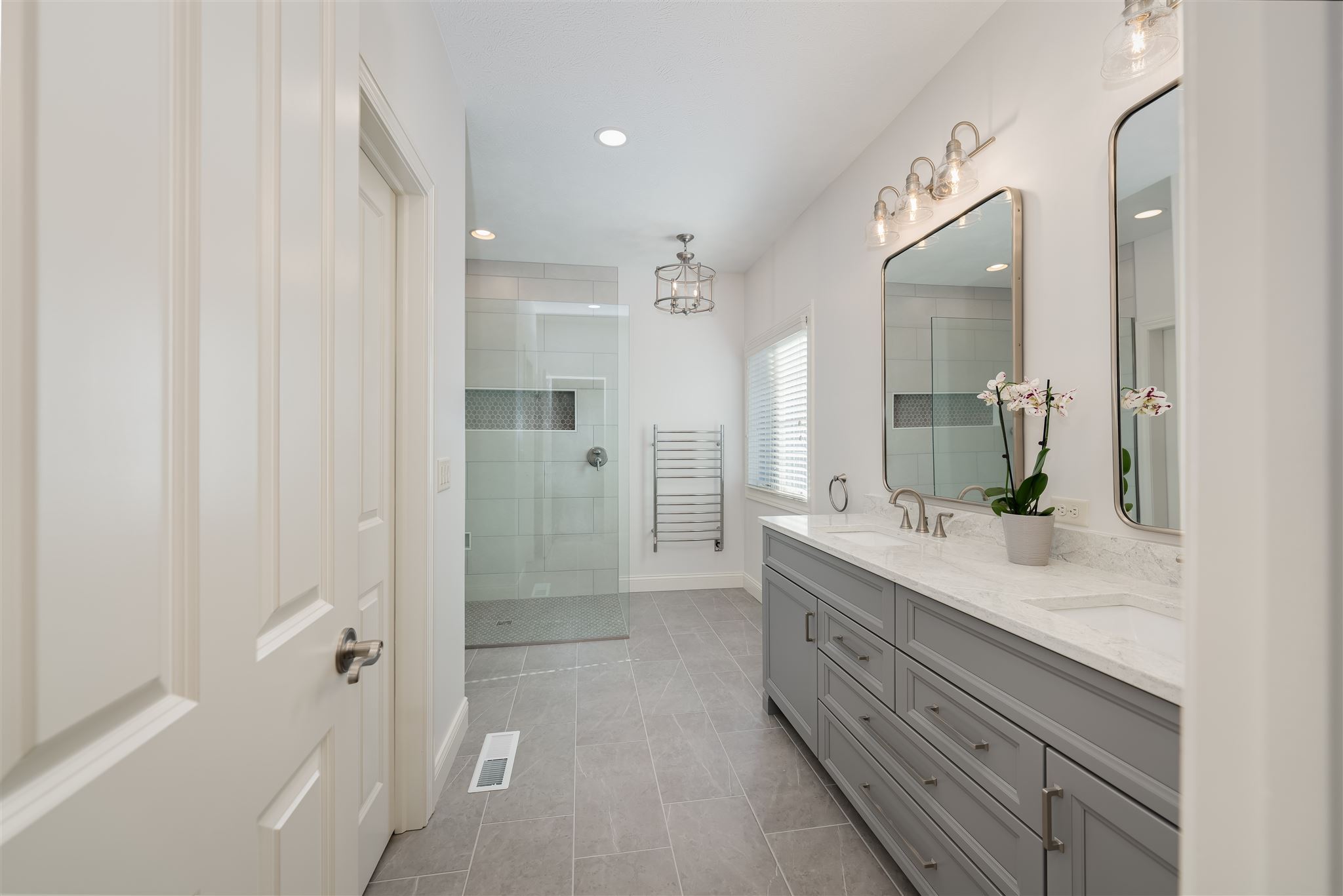 Eliminating the garden tub and rearranging the shower and sink locations completely transformed this primary bathroom from cramped to spacious! A generous walk-in shower, double sink vanity, towel warmer and soft color palette add to the conveniences and the aesthetics of this dramatic remodel.