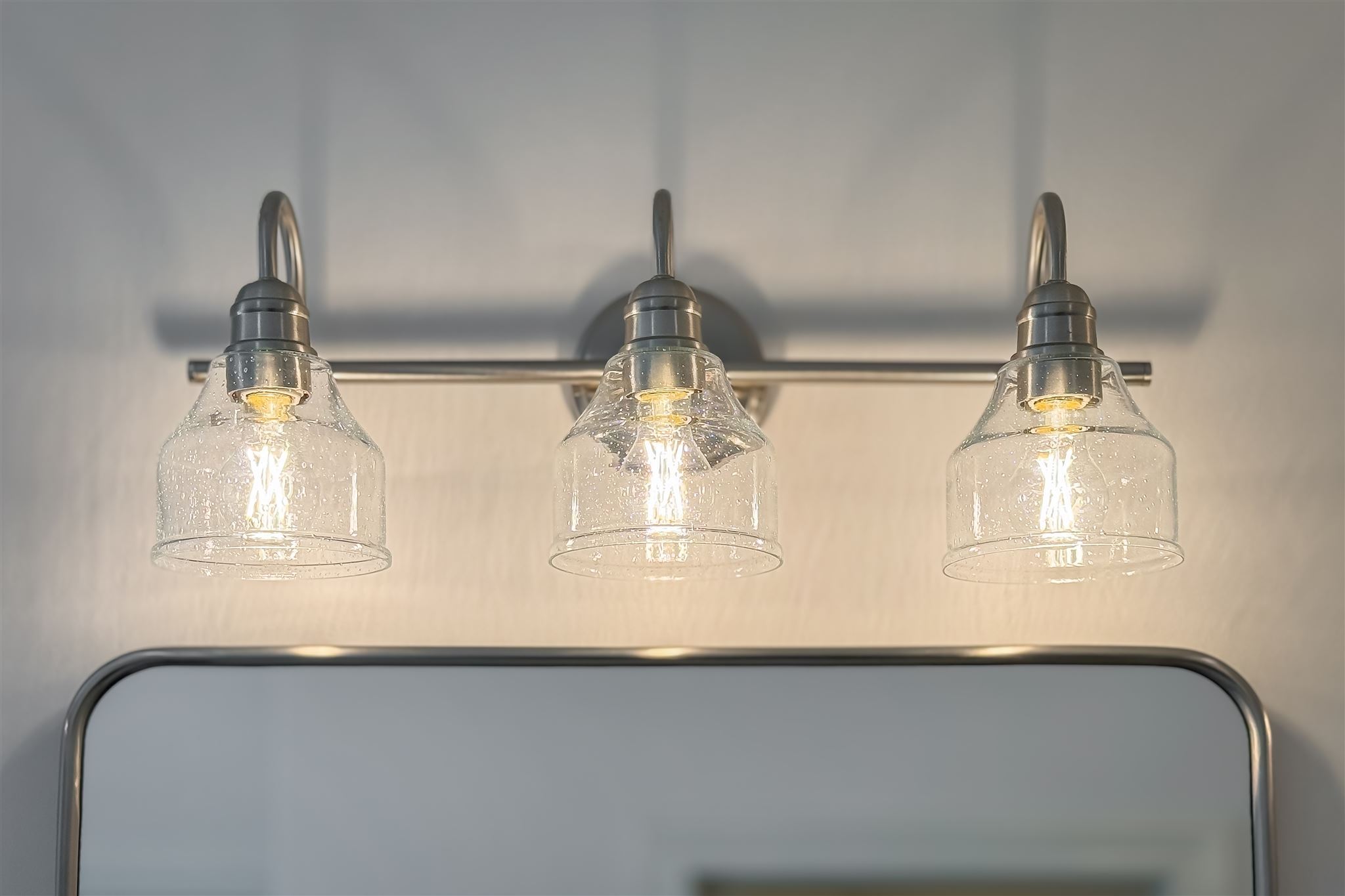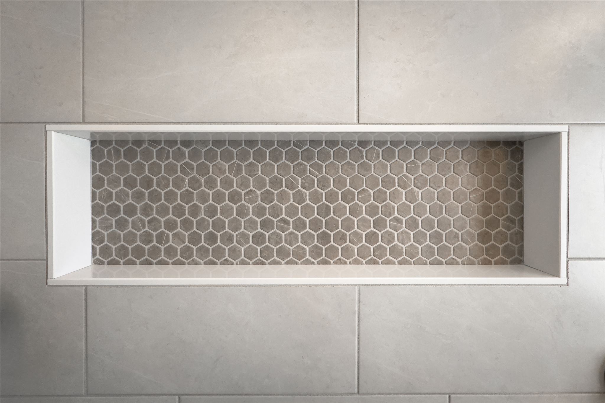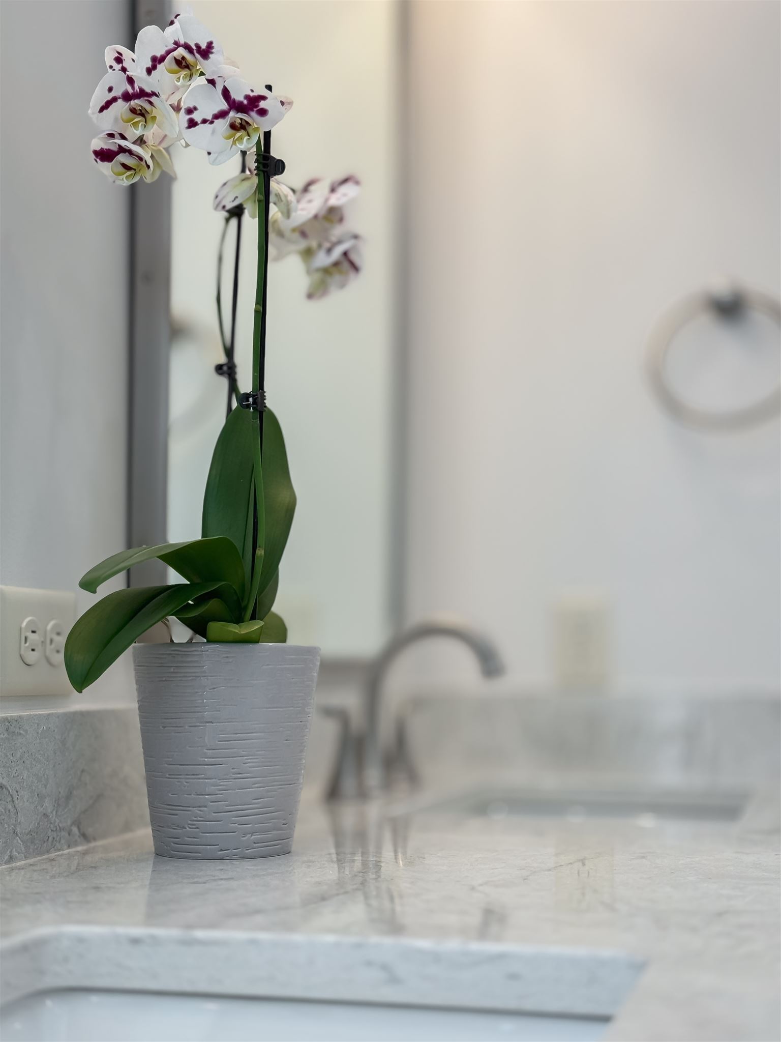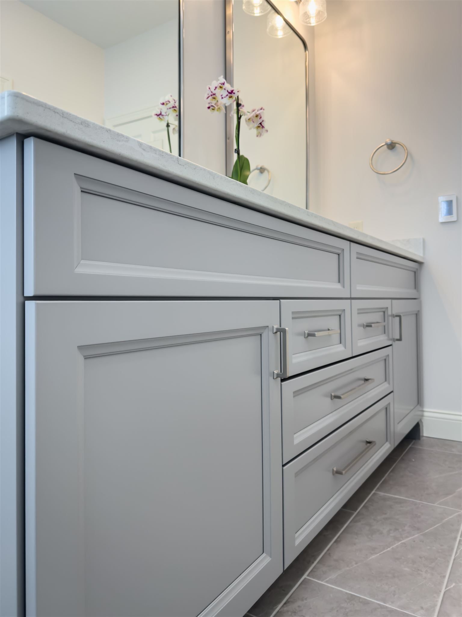 Eliminating the garden tub and rearranging the shower and sink locations completely transformed this primary bathroom from cramped to spacious! A generous walk-in shower, double sink vanity, towel warmer and soft color palette add to the conveniences and the aesthetics of this dramatic remodel.
