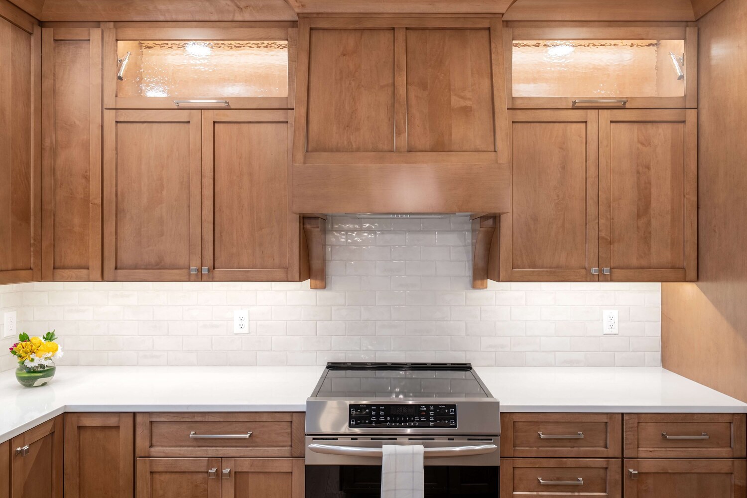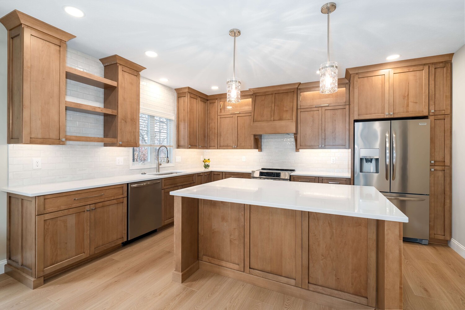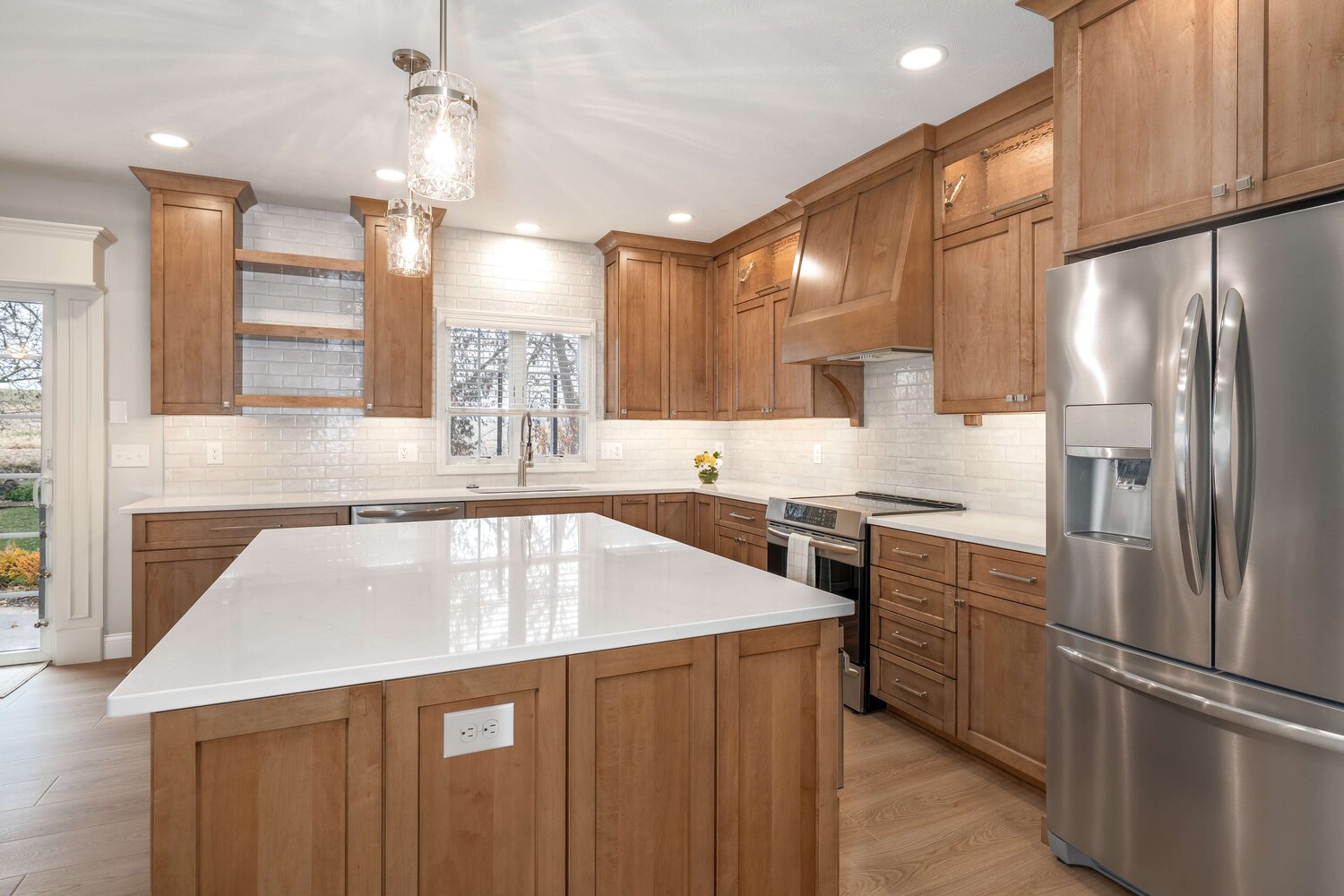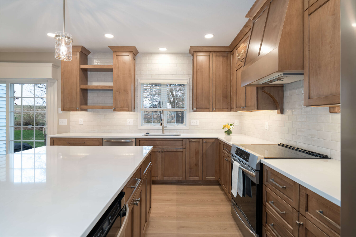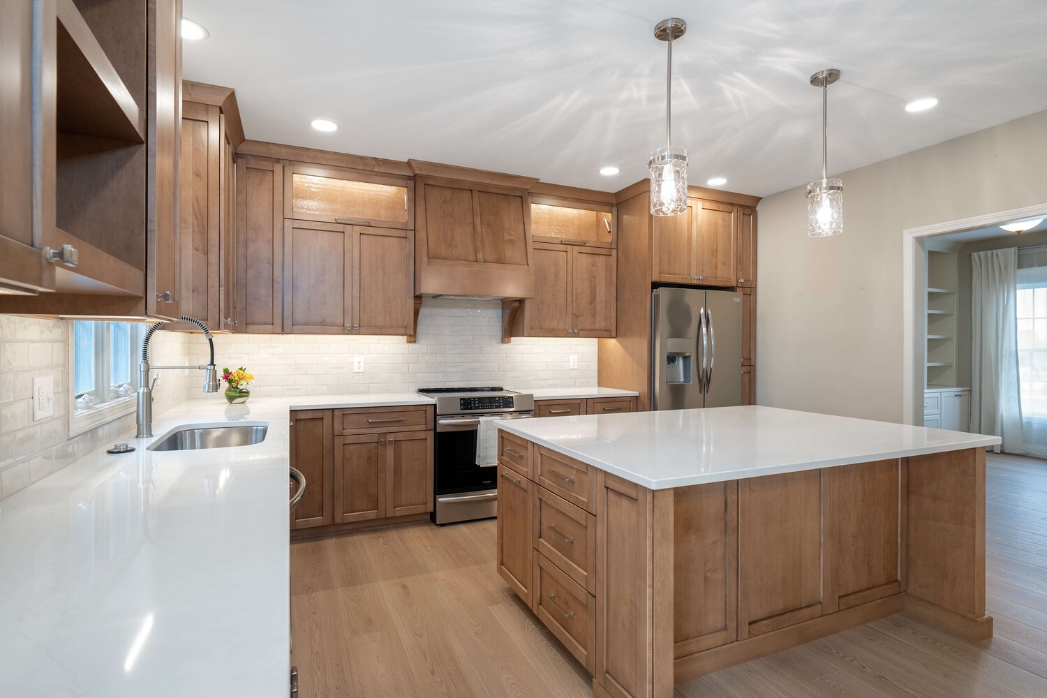 The efficient layout of this kitchen worked well for the homeowner, but the finishes needed a refresh. Medium toned wood cabinetry stretching to the ceiling, classic hand-glazed backsplash tile, and a statement range hood take this kitchen from functional to fabulous! Even the home office benefitted from fresh, new cabinetry and now both rooms are harmoniously joined together by warm plank flooring.