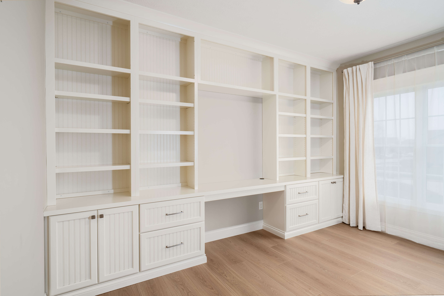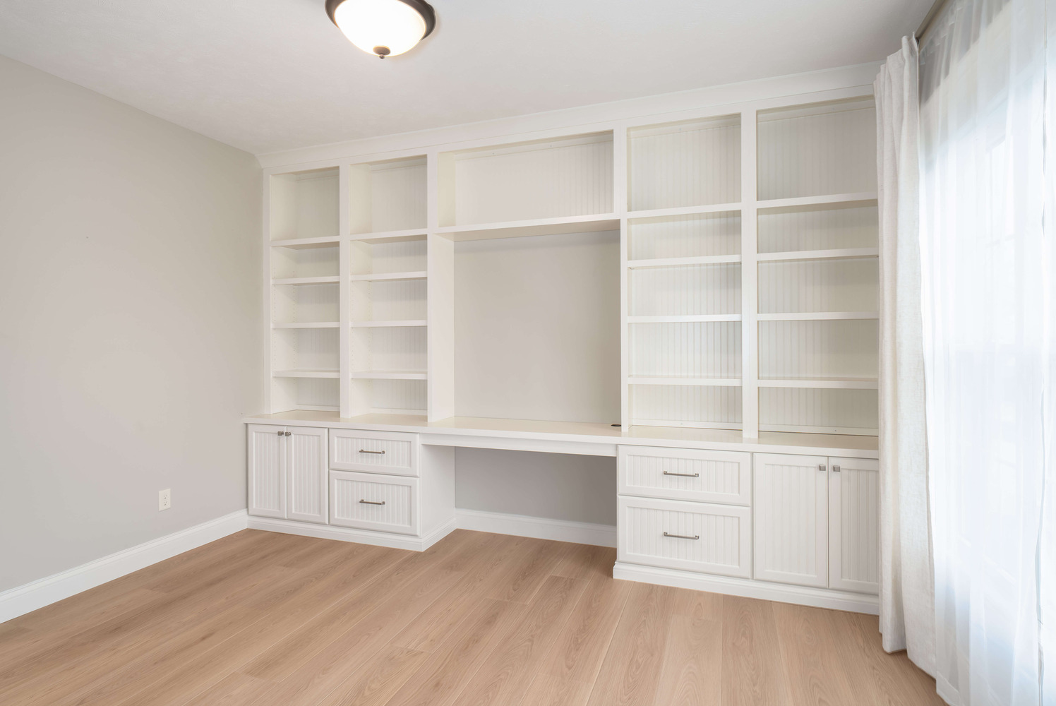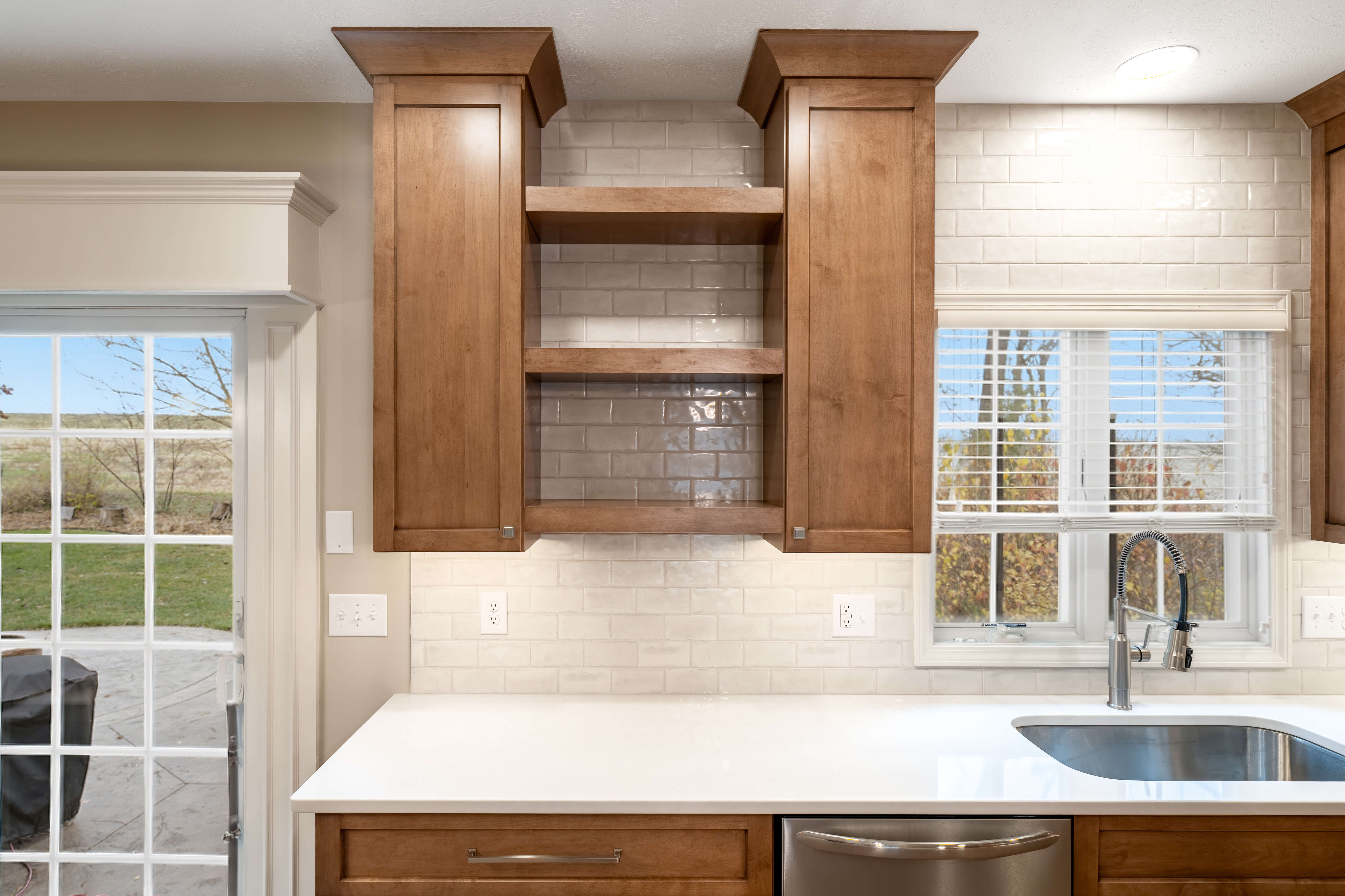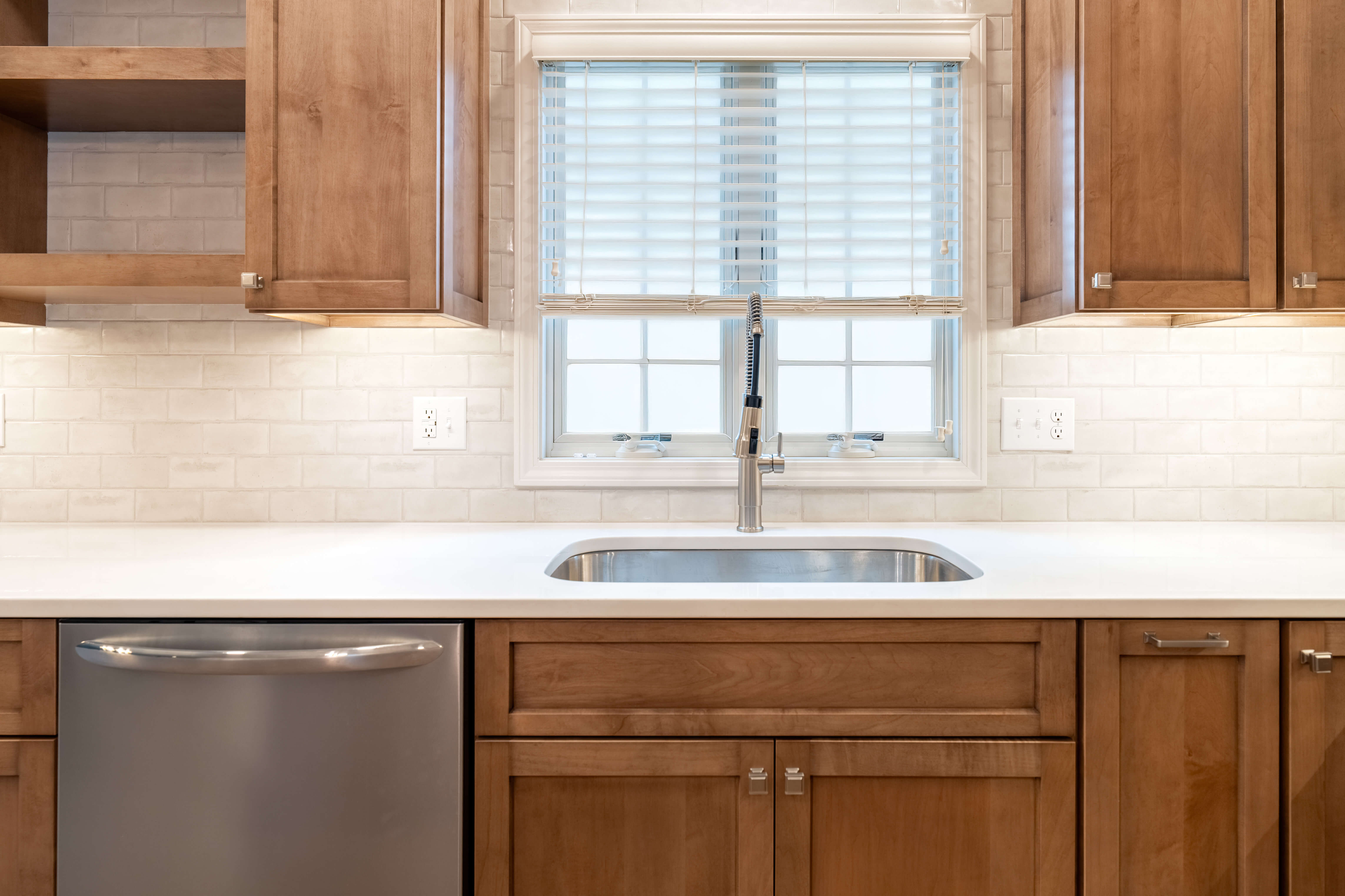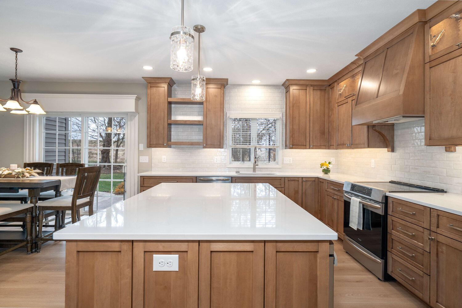 The efficient layout of this kitchen worked well for the homeowner, but the finishes needed a refresh. Medium toned wood cabinetry stretching to the ceiling, classic hand-glazed backsplash tile, and a statement range hood take this kitchen from functional to fabulous! Even the home office benefitted from fresh, new cabinetry and now both rooms are harmoniously joined together by warm plank flooring.